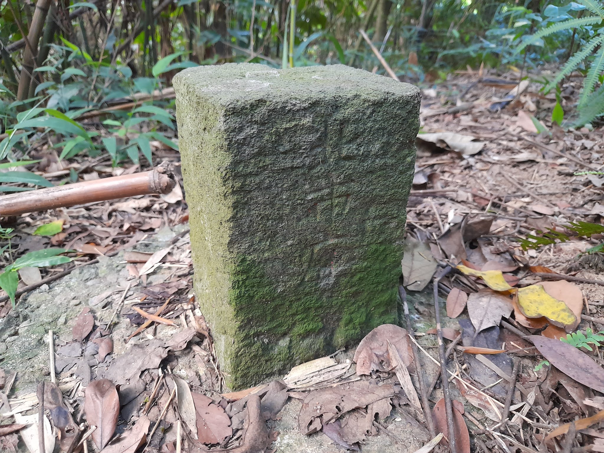 竹叢地後有兩顆大波蘿蜜樹,掉在地上波羅蜜果實都已經腐爛,10:18往前山丘就是阿泉坑山86m西北峰,鑛務課第一一O七號基點就在攀植內,我只稍微砍出一條小路不要太顯眼,也希望山友低調不要砍草,這裡農民很"交怪"..