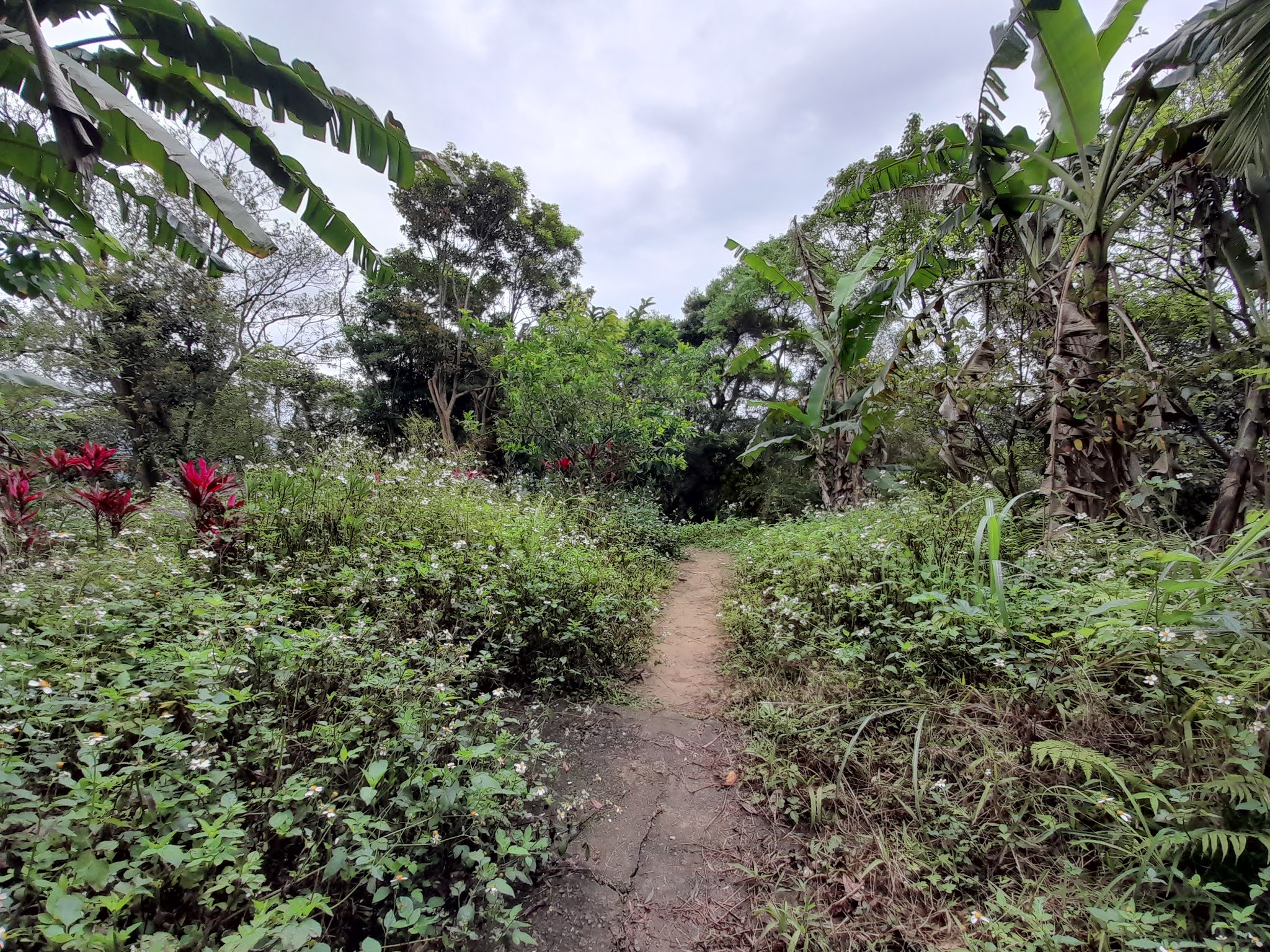 轉右而下在10:15銜接上游中華科大上來步道,轉右而上於10:17上來岔路先探勘左邊舊時越嶺路,過觀景點風景已被樹林阻礙,後一路從竹叢林下坡抵達窪地菜園地。