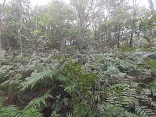 後進行探勘猴湖路線,沿稜而下山徑受蕨植掩徑,初段路還可藉由舊路條砍出一條路痕,朝東而下在9:47受大段路無路條因而撤退。