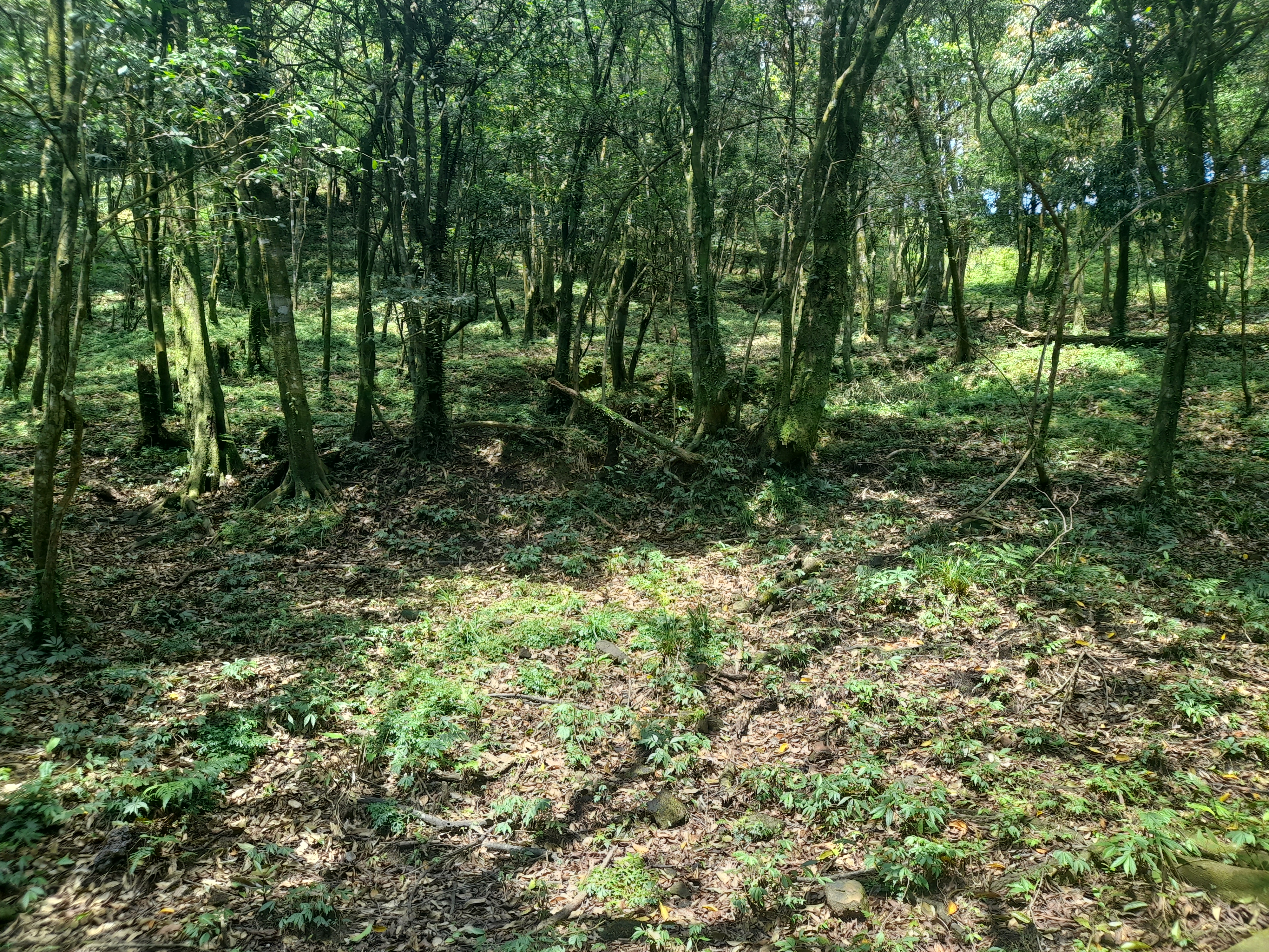 8:53由大樹登山口起登,陡上坡路沿西穿梭蕨植有路痕,6分鐘上來南洋杉寬闊林地,依舊朝西穿越林地往上走。