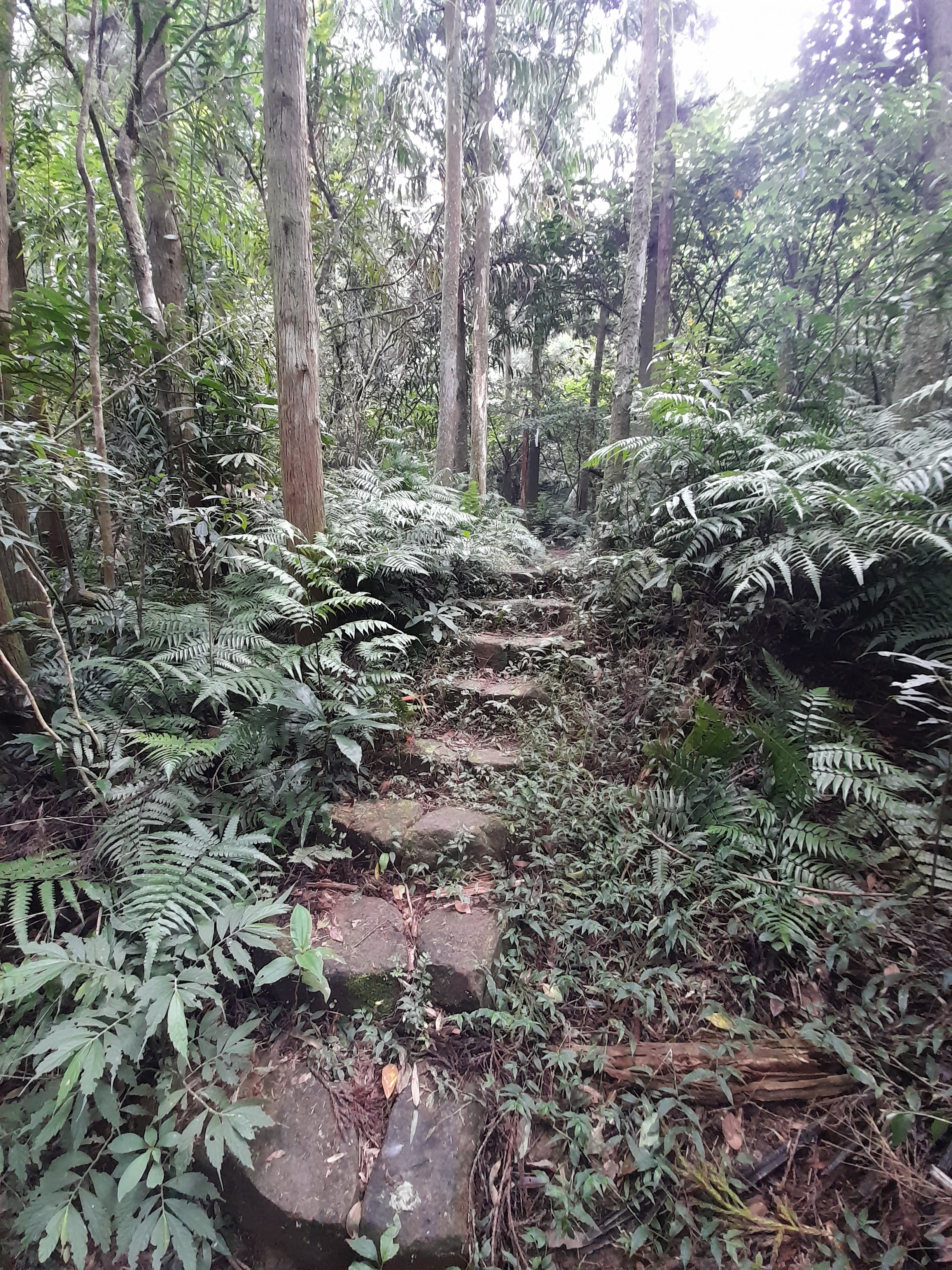 深谷、水圳遺痕從田埂路而上,層層駁坎、大樹上寄生山蘇、過溪流時洗把臉提振精神,所處森林就是美。