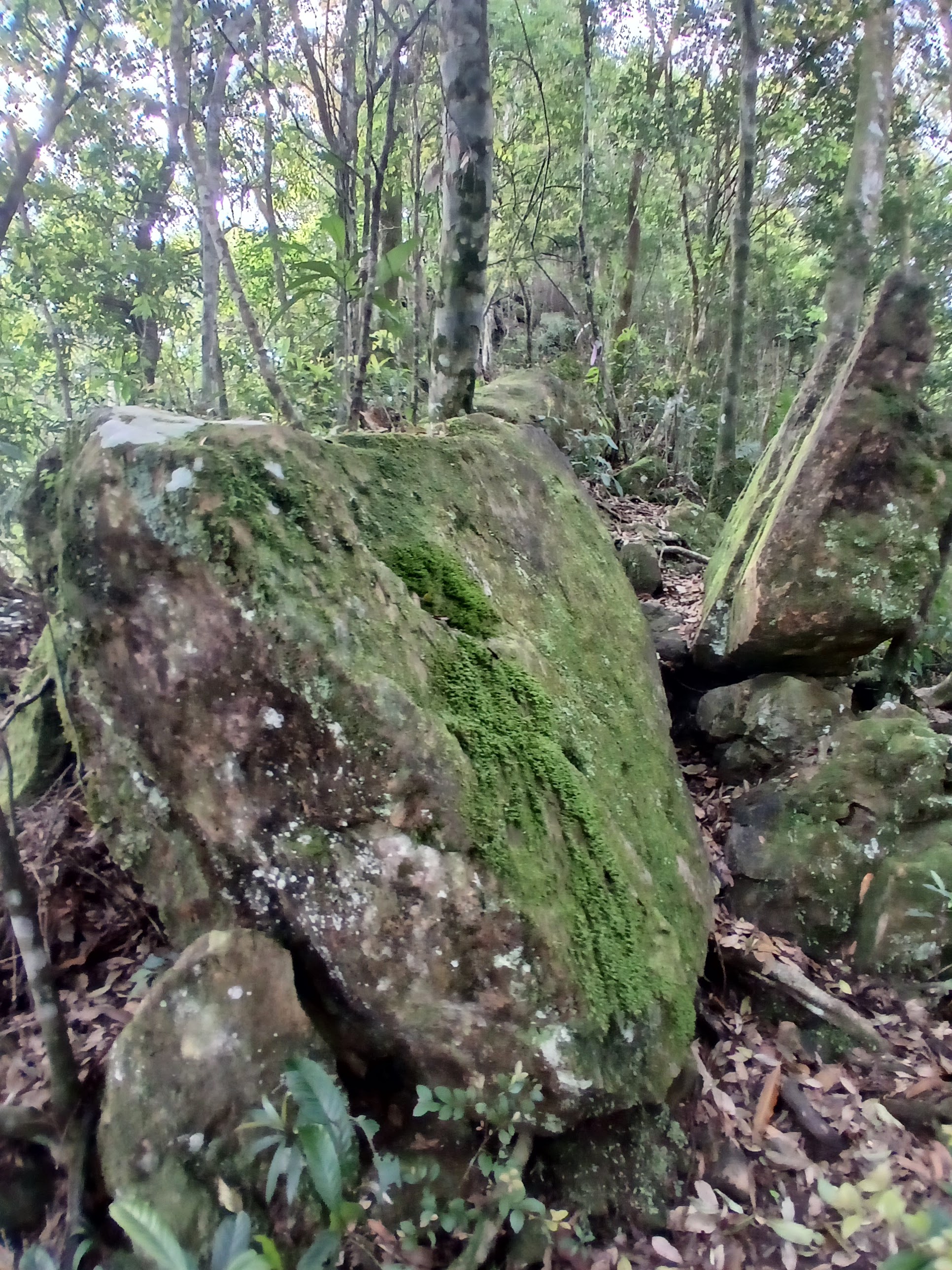 續稜而行之後進入岩石區段,這一路上觀看各種形貌岩石、大樹,從樹藤處進入陡坡路依舊是大桶山、烏來山景色。